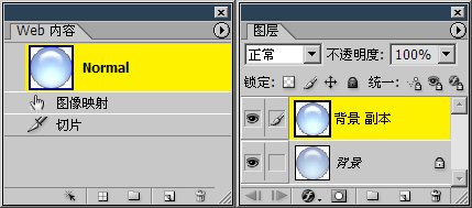 位于下方的Over代表鼠标接触事件,因此我们在图层调板中显示背景副本层并隐藏背景层(在这里由于图层的遮盖关系即使不隐藏也不影响最终效果)。如下下图。可以从Web内容调板中看到平时和鼠标接触两种不同的效果。