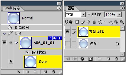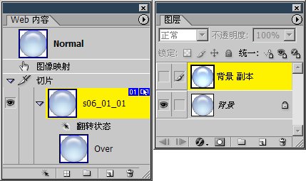 点击Web内容调板下方的新建按钮,将建立一个翻转设定。位于上方的s060101代表正常状态,因此我们要在图层调板中隐藏背景副本层,如下上图。