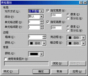 表格有立体的感觉的全是因为在表格的右边和下边有浅黑色的阴影。所以我们只要实现了阴影就可以实现这种效果。现在我们就开始具体讲述制作过程。在Frontpage2000中新建一个表格,选择菜单“表格”-“属性”-“表格”,在窗口内将表格的宽度设置为150象素;高度设置为200象素;边框粗细设置为0;将单元格边距设置为0,而单元格间距为1,如图二所示。