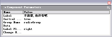 图1   设计flash用户界面:从window/components/flash ui components中拖三个RadioButton到舞台中,   设置标签,其他为默认值。(从属性面板和组件参数面板均可以设置)