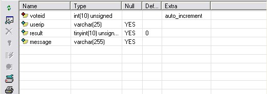 者对asp比较熟悉,xml可以将复杂的问题简化,采用mysql的原因是access我没有安装,程序不需要任何存储过程,所以无需动SQL Server ,Oracle等重兵器.   问题分析:本投票程序是选择题,故我们用一个字段存储用户的答案即可.   建立数据库和表:表名称和数据库名称任意,字段定义如下:   voteid无符号整数自动编号   result短整数存储用户选择本程序范围在0-2   userip char (25)用户ip地址实际长度21   message char(255)附加消息//这个程序未用   使用mysql-front创建,如下图所示: