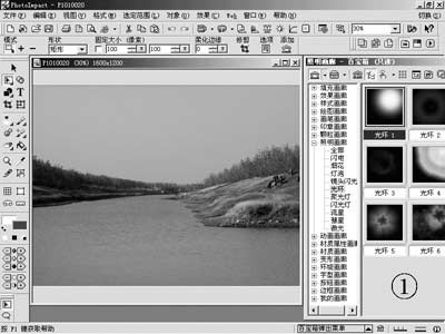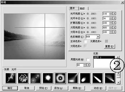 制作太阳。单击“百宝箱”中的“照明画廊”前的“+”打开该目录,选择“光环”,如图1,这里软件已为您准备了几种预先设定参考值的光环,根据自己的需要选择一种,然后单击鼠标将其拖到相片编辑界面上;