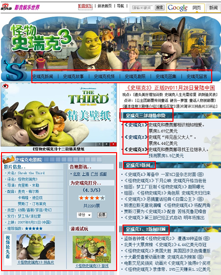 这是《怪物史瑞克》的新浪专题第一屏内容,在这里面,SEO理论同精心编辑的海量内容紧密结合起来: