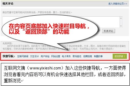 互联网文摘(www.yixieshi.com)加入这些快捷导航,一方面使得浏览者看完内容后可以有机会快速选择其他栏目,或者返回顶部,重新浏览互联网文摘在底部加入返回顶部的功能,主要也是希望用户尽量就用鼠标点击就能实现各个栏目的互通和当前页重新定位,而不是利用万恶的鼠标滚轮。