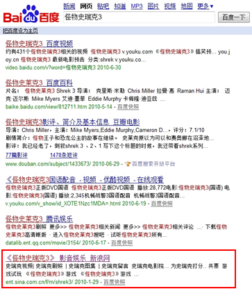 内容的建设应该是长效的,有针对性的,并且内容应该在广度和深度上提升,期望带来更好的阅读体验,这样才能真正将内容在搜索引擎中的权重提高。新浪网在专题制作上也是值得认真学习的,就拿百度搜索“怪物史莱克”,排名前两位都是百度的产品,暂且不表,三四五位依次是:豆瓣,优酷和腾讯专题,而新浪的内容专题就排在第六位,在原来百度未调整自身产品权重的时候,以及视频网站并未发力之前,新浪的娱乐类专题一直都是占据前三的位置。
