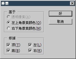 将新建层与背景层合并,然后【图像>修整】,如下右图所示。确定操作后图像将被裁剪为和所画的圆同等大小。这个命令的作用是根据左上角第一个像素处,或右下角最后一个像素处的颜色,在我们这幅图像中这两个地方都是白色。然后就将画面中连续的白色部分裁剪掉。这就好像现实中打印图像之后将纸张的边缘裁剪掉一样。