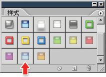 【窗口>样式】调出样式调板,点击右上角圆三角按钮,选择“替换样式”,在出来的样式列表目录中选择“Web翻转样式”,确认目前选择的是新建层,然后使用“选中状态的蓝色胶体按钮”样式。如下中图红色箭头处。大家也可以自己选择其他颜色的。