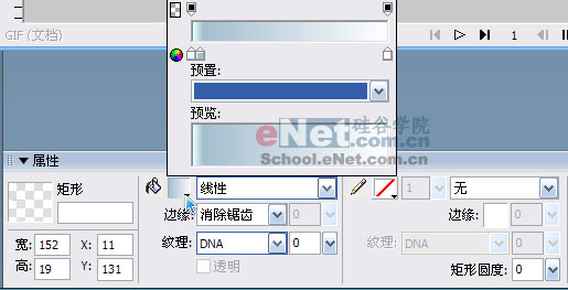 3. 利用矩形工具绘制一个宽 152,高 19 的矩形,在属性检查器中设置描边为无,填充类别改为线性, 修改线性填充的颜色样本,第一个颜色样本的颜色为#E6FFFF,然后单击渐变色阶下面的区域,新增 一个新的颜色样本,颜色为 #A4BECF,最后一个颜色样本为 #FFFFFF,具体设置如图所示: