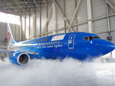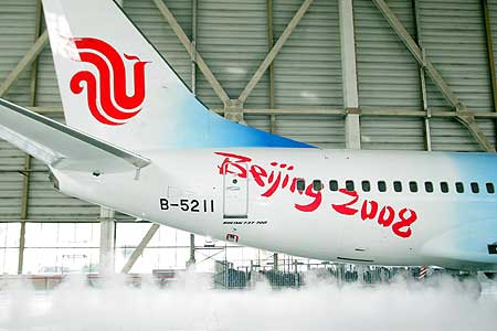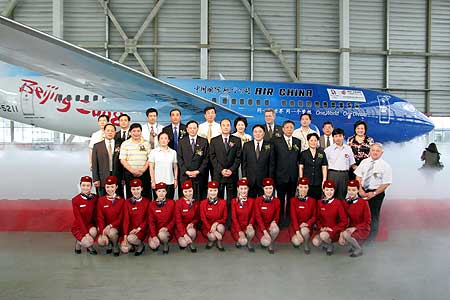 这架国航北京奥运号飞机由北京飞机维修工程有限公司实施机身喷涂。据介绍,飞机大翼部位的渐变色彩喷漆难度很大,在国际上还是第一次。国航第二架北京奥运号飞机将在9月底亮相。