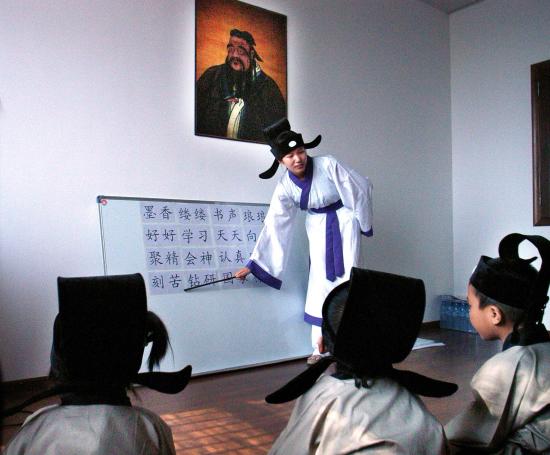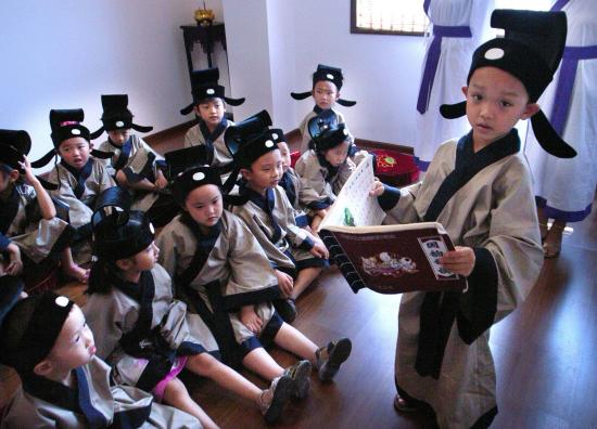 2006年8月13日,一个名叫“童学馆”的现代私塾在武汉开馆。45名幼儿着古代冠帽和汉服,向孔子像行礼后,端座在蒲团上学习国学。浸泡在中国传统文化氛围中,鉴赏国粹、诵读国韵和学习礼仪等,“童学馆”教学持续4 个月时间每周上一次课,让幼儿接受国学教育。图为幼儿正在老师指导下,学习新编蒙学教材“国韵诵读”。