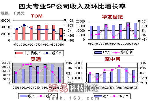 政策影响:以TOM为例,取消按条收费定制直接导致SMS、MMS业绩下降。WAP业务由于免费试用一月及清理沉默用户,不得不改为按量收费,而之前90%的收入均来自按月收费,导致该收入减少11.5%。IVR服务由于暂停大部分交叉营销活动导致业绩下降31.3%。另外,政策改变导致市场竞价激烈,CRBT彩铃服务收入减少50%。预期未来运营环境将更加严峻与苛刻,TOM业绩将继续下滑。